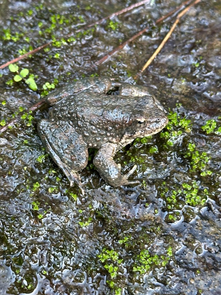Although it is pretty clear we love spring-run Chinook salmon an awful lot, there is another endangered creature we are quite fond of as well. The Foothill Yellow-legged Frog is a fairly regular visitor to the creek banks of Butte, however they are not easy to see. As you can see from this photo, they blend in with the rocks, moss, sand, and gravel real well. There are a number of threats to the FYLF. Of course, out of season turbidity/pollution events like the flume failure are very concerning. Eggs are laid and hatch in the edges and backwaters of the creek in the spring time and fluctuating water levels can have an impact. One unlikely predator of FYLF is the invasive bullfrog. Bullfrogs are generally confined to off channel ponds but they have been spreading up the canyon and threaten not just FYLF but also Western Pond turtles. Baby turtles emerge from eggs buried uphill from the creek and backwaters where pond turtles hang out. As they migrate back to water, bullfrogs will eat the baby turtles. We highly encourage anyone who knows where there are bullfrogs to explore methods of eliminating them. The FYLF and Western Pond Turtles will thank you!
